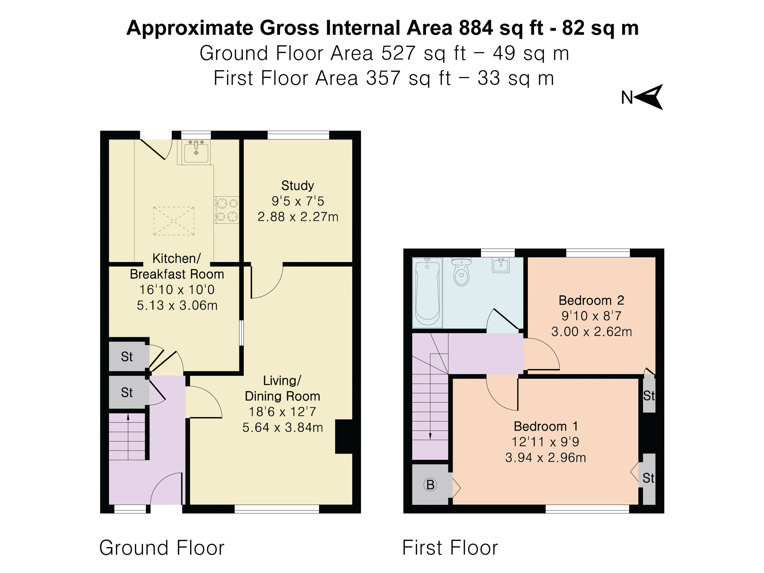On the first floor, the landing gives access to two well-proportioned bedrooms. The main bedroom overlooks the greensward to the front and includes two useful storage cupboards, one of which houses the gas-fired combination boiler. The second bedroom enjoys views over the rear garden and also benefits from a built-in storage cupboard. The bathroom is fitted with a white suite including panel bath with shower above, wash basin and WC.